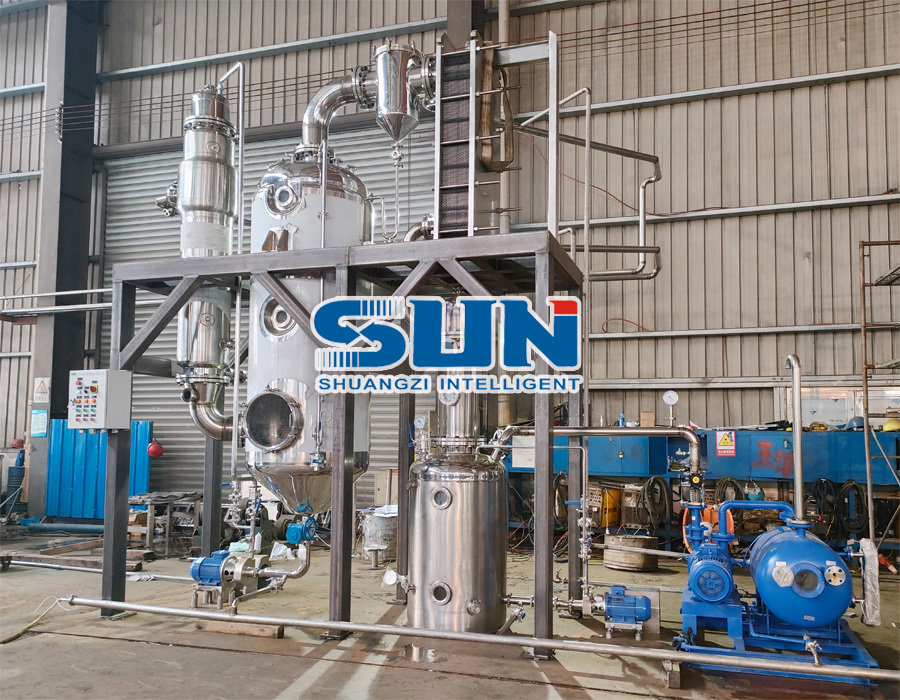 Apparatus principaliter consistit in calefaciente, separatore, condensatore etc. In operatione, liquor nutritus aequaliter distribuitur ad murum interiorem tubi calefactionis per distributorem, formans velum cadentis uniformem gravitatis et vaporis secundi. Vapor in tubulum extra calefactionem introducitur, et calor per murum tubulum transfertur ut liquorem nutritum rapide ferveat et vaporet. Generatus secundarius vapor et liquor congestus separator ad separationem intrant. Secundarius vapor condensus et emissus est, liquidus autem densus colligitur post intentionem scopum.
